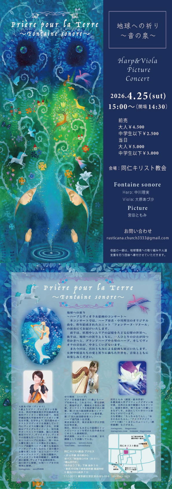 2026年4月25日(土)に東京都文京区「同仁キリスト教会」にてハープとヴィオラ&絵画のコンサートが開催されます♪