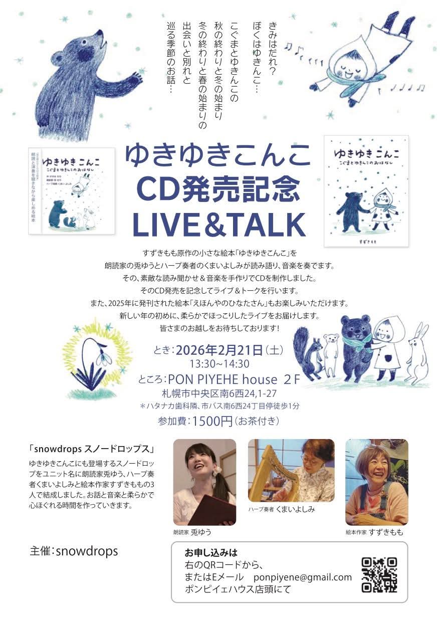 2026/2/21(土)に札幌市の「PON PIYEHE house 2F」で 「ゆきゆきこんこCD発売記念LIVE&TALK」が開催されます。このCDにはおとつぶハープユーザーでもあり、おとつぶガイドでもあるハープ奏者のくまいよしみさんがおとつぶハープで参加されており、LIVE&TALKにも出演されます。